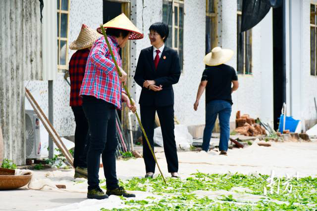 饶平法院浮山法庭干警在晒茶现场对接农户法律需求。