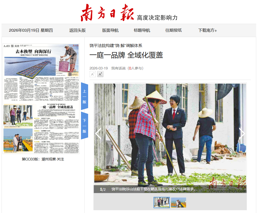 当前,饶平县人民法院立足六个基层法庭的建设改造规划,以“饶·解”调解体系为统领,结合司法实践,推动完善六个调解子品牌,构建起覆盖山海城乡、适配多元解纷需求的基层实质解纷体系,把司法服务送到群众家门口。2025年,饶平法院获评全市法院实质解纷优胜单位,近五成民商事案件以调解撤诉形式结案。