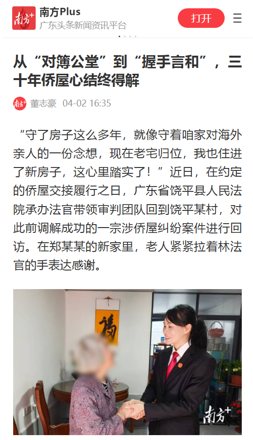 “守了房子这么多年,就像守着咱家对海外亲人的一份念想,现在老宅归位,我也住进了新房子,这心里踏实了!”近日,在约定的侨屋交接履行之日,广东省饶平县人民法院承办法官带领审判团队回到饶平某村,对此前调解成功的一宗涉侨屋纠纷案件进行回访。在郑某某的新家里,老人紧紧拉着林法官的手表达感谢。