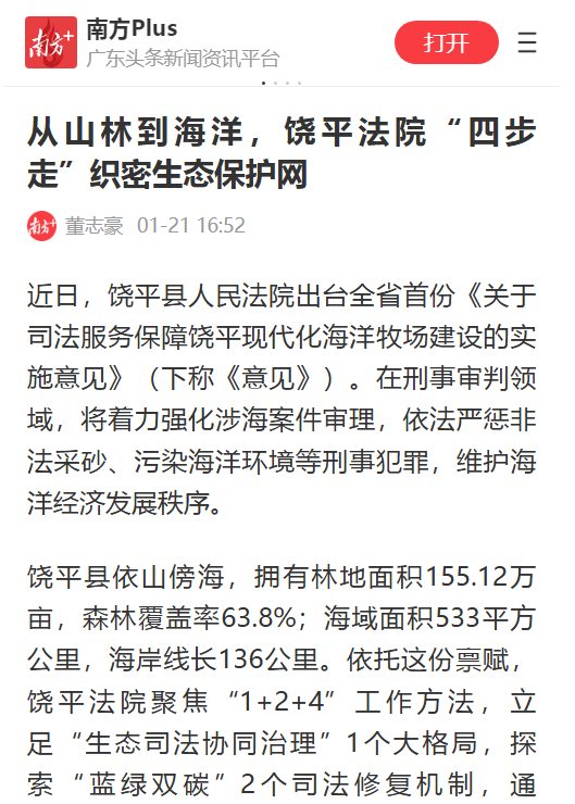 近日,饶平县人民法院出台全省首份《关于司法服务保障饶平现代化海洋牧场建设的实施意见》(下称《意见》)。在刑事审判领域,将着力强化涉海案件审理,依法严惩非法采砂、污染海洋环境等刑事犯罪,维护海洋经济发展秩序。